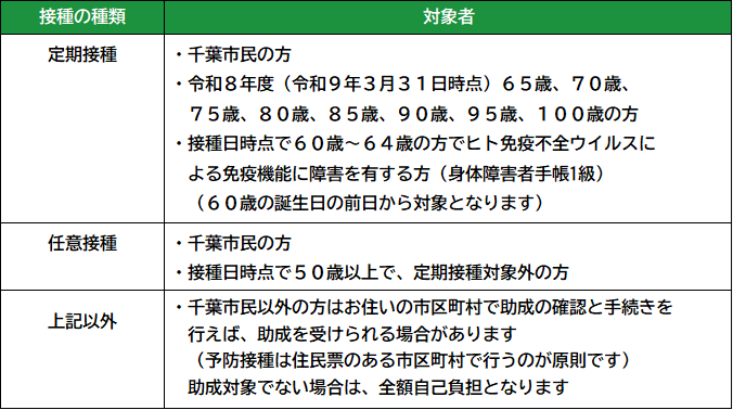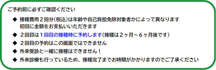 帯状疱疹ワクチン予防接種 ~ 申し込み前の確認 ~ 千葉市民である: はいいいえ 以下に該当する千葉市民である (1)令和8年度中に65歳になる方(昭和36年4月2日~昭和37年4月1日生まれの方)(2)令和8年度中に70歳になる方(昭和31年4月2日~昭和32年4月1日生まれの方)(3)令和8年度中に75歳になる方(昭和26年4月2日~昭和27年4月1日生まれの方)(4)令和8年度中に80歳になる方(昭和21年4月2日~昭和22年4月1日生まれの方)(5)令和8年度中に85歳になる方(昭和16年4月2日~昭和17年4月1日生まれの方)(6)令和8年度中に90歳になる方(昭和11年4月2日~昭和12年4月1日生まれの方)(7)令和8年度中に95歳になる方(昭和6年4月2日~昭和7年4月1日生まれの方)(8)令和8年度中に100歳になる方(大正15年4月1日~昭和2年4月1日生まれの方)(9)接種日時点で60歳~64歳の方で、ヒト免疫不全ウイルスにより免疫機能に身体障害1級の障害を有する方※(10)50歳以上で上記条件に該当しない(11)49歳以下で上記条件に該当しない ※身体障害者手帳の氏名、等級、障害の内容がわかる部分の写しを取り、予診票に添付すること。※60歳の誕生日の前日から対象となる。※高齢者インフルエンザ等と異なり、心臓、じん臓、呼吸器機能に障害を有する方であっても、高齢者帯状疱疹予防接種の対象とならない。 接種費用2回分(税込)は 44,000円 です。 初回に全額をお支払いいただきます。 ご了承いただける方はこちらをクリックして予約をお願いいたします。 接種費用2回分(税込)は以下の表を参照してください。 初回に全額をお支払いいただきます。 自己負担区分 対象者 接種費用 自己負担あり 下記以外の方 20,000円 一部免除(半額) 市民税非課税世帯に属する方 10,000円 全額免除 生活保護受給者 中国残留邦人等支援給付受給者 無料 ご了承いただける方はこちらをクリックして予約をお願いいたします。 接種費用2回分(税込)は 34,000円 です。 初回に全額をお支払いいただきます。 ご了承いただける方はこちらをクリックして予約をお願いいたします。 斎藤労災病院ホームページへ