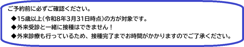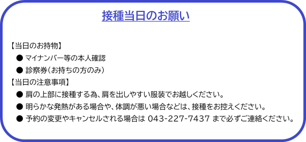 新型コロナワクチン予防接種 ~ 申し込み前の確認 ~ 千葉市民である: はいいいえ 以下に該当する千葉市民である (1)接種日時点で65歳以上の方(65歳の誕生日の前日から接種可能)(2)接種日時点で60歳~64歳の方(60歳の誕生日の前日から接種可能)で、心臓、じん臓、呼吸器機能に身体障害1級の障害を有する方またはヒト免疫不全ウイルスにより免疫機能に身体障害1級の障害を有する方(3)上記条件に該当しない ※身体障害者手帳の氏名、等級、障害の内容がわかる部分の写しを取り、予診票に添付すること。※障害名が心臓・じん臓・呼吸器・免疫機能のいずれかであり、かつその障害の等級が1級であること。 接種費用(税込)は 14,300円 です。 ご了承いただける方はこちらをクリックして予約をお願いいたします。 接種費用(税込)は以下の表を参照してください。 自己負担区分 対象者 接種費用 自己負担あり 下記以外の方 8,000円 一部免除(半額) ●市民税非課税世帯に属する方 ・下記の(1)~(2)の書類のうち、いずれか一点が必要 (1)令和7年度発行の以下の書類のうち、「介護保険料算定の基礎の保険料段階欄に 「1」、「2」、「3」のいずれかが記載されたものの写し ・介護保険料決定(変更)通知書 ・介護保険料決定通知書兼特別徴収開始(中止)通知書 (2)予防接種自己負担金免除対象確認書 ・他自治体からの転入者は以下の二点が必要 ・現在の世帯全員が記載されている千葉市の住民票 ・令和7年1月1日時点で居住していた市町村が発行する、世帯全員の非課税証明 4,000円 全額免除 ●生活保護受給者 生活保護受給証明書が必要 ●中国残留邦人等支援給付受給者 中国残留邦人等の支援給付受給証明書または中国残留邦人等の支援給付が 決定されている事を証明する旨の記載のある本人確認証の写しが必要 無料 ご了承いただける方はこちらをクリックして予約をお願いいたします。 お住いの市町村で発行された予診票を持参してください。 ご了承いただける方はこちらをクリックして予約をお願いいたします。 斎藤労災病院ホームページへ